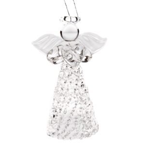 Krásny sklenený anjelik so svätožiarou bude skvelým doplnkom vianočnej výzdoby. V rukách drží malé srdiečko.