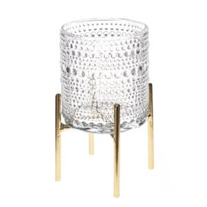Kúpte si do svojho domova tento krásny svietnik so zlatými nožičkami. Sklo má zaujímavý plastický dekor v podobe malých koliesok. Svietnik pôsobí elegantne a veľmi luxusne.
