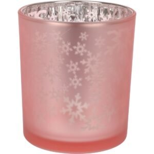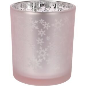 Krásny ružový svietnik s malými vločkami skvele dotvorí vianočnú atmosféru v interiéri. Postavte si ho na sviatočný stôl alebo na poličku.