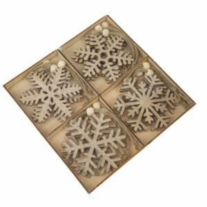 Nádherná sada drevených vločiek sa bude hodiť na ozdobenie vianočného stromčeka, umelej girlandy alebo vetvičiek vo váze. Vločky na sebe majú drobné trblietky. Rozmery jednej vločky 8 x 8 x 0,2 cm.