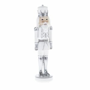 Krásna dekorácia luskáčika sa hodí na postavenie na poličku alebo jedálenský stôl. Je vyrobená v klasických vianočných farbách, bielej a striebornej.