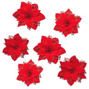 Sada šiestich červených kvetov poinsetií so štipcom skvele doladí vašu vianočnú výzdobu. Vďaka štipcu sa ľahko pripevní aj na menšie vetvičky. Sú ideálne na ozdobenie vianočného stromčeka, vencov a girland.Balenie obsahuje šesť rovnako veľkých kvetov s priemerom 15 cm.