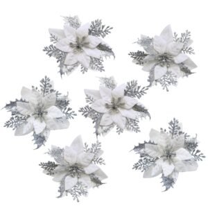Sada šiestich strieborných kvetov poinsetií so štipcom skvele doladí vašu vianočnú výzdobu. Vďaka štipcu sa ľahko pripevní aj na menšie vetvičky. Sú ideálne na ozdobenie vianočného stromčeka, vencov a girland.Balenie obsahuje šesť rovnako veľkých kvetov s priemerom 15 cm.