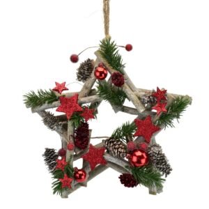 Závesná vianočná hviezda dodá vášmu interiéru tú pravú vianočnú atmosféru. Je vyrobená z prírodných vetvičiek s jemnou bielou patinou a ozdobená červenými hviezdičkami, guľôčkami, prírodnými šiškami a umelými smrekovými vetvičkami.Dekorácia je kvalitne spracovaná. Vďaka jutovému povrázku ju ľahko zavesíte do okna aj na vchodové dvere.