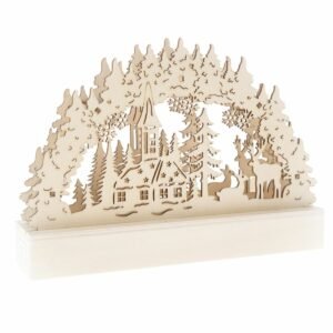 Nádherná drevená dekorácia skvele doplní vianočnú výzdobu. Vhodná na okenný parapet alebo jedálenský stôl. Drevené zátišie s jeleňmi a malým kostolíkom vám vykúzli doma kúzelnú atmosféru. Napájanie 2x AA batéria, nie je súčasťou balenia.