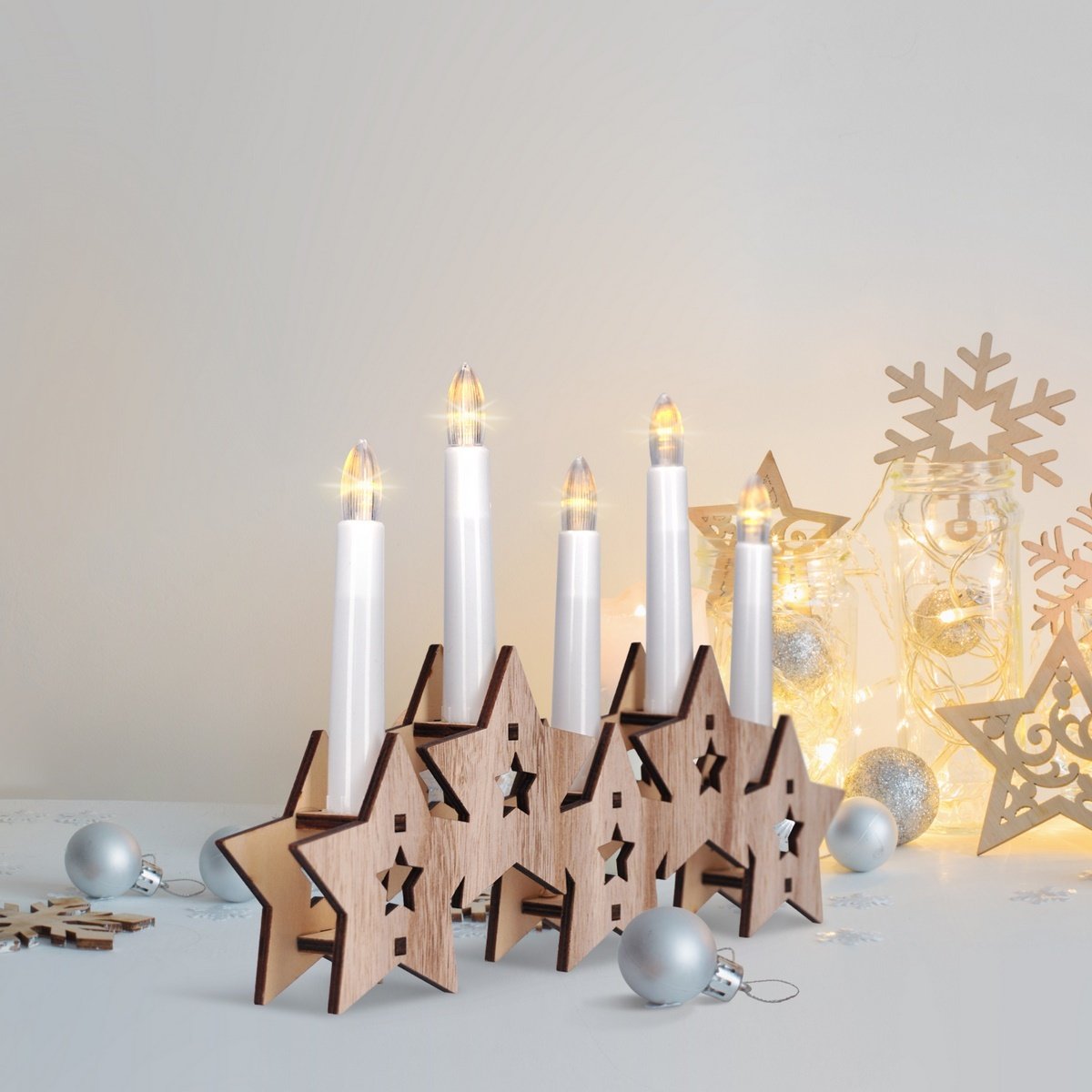 Vianočný svietnik z drevených hviezd, ktoré sú doplnené 5 LED sviecami navodí tú správnu vianočnú atmosféru. Svietnik je napájaný 2 AA batériami, ktoré nie sú súčasťou balenia. Farba svetla teplá biela. Technické parametre a špecifikácie: počet LED diód: 5 počet sviec: 5 napájanie: 2 x AA batéria (nie sú súčasťou) výdrž batérií: cca 100 hodín v závislosti na kvalite batérií trieda ochrany: IP20 vnútorné použitie rozmer: 30 x 20 x 3,5 cm farba: prírodné drevo balenie: farebná krabica